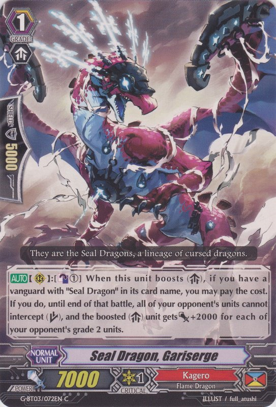 Ever wanted a 13k booster easily that can boost either vanguard or rearguard? One that isn't reliant on how many soul-charges or cards you call? Meet Gariserge, which for a counterblast, can become up to a 17k booster. As well as that your opponent cannot intercept.