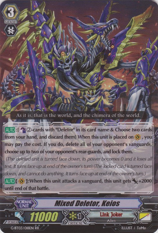 It's a shame that Deletors that can compliment him other then Greidholl are very expensive cost wise. . I wouldn't mind too much, but the only way we can stride then delete is using Keios, who is pretty damn expensive, and his discard has crippled me several times. I pray for a Grei-stride for Fighter's Collection 2016. Please Bushiroad!