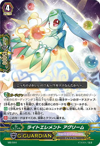 G-Guardians are a new defensive mechanic originally revealed in the Vanguard Anime that allows you to superior call a 15k shield from the G-Zone to the guardian circle if you discard a heal. After the battle the G-Guardian returns to the G-Zone face up. Clan based G-Guardians also gain 5k more shield if you can successfully resolve their ability. This slows down the game a little bit, allowing you to get more shield out of your heal trigger, as well as being able to guard Glory and Tom skills with ease.