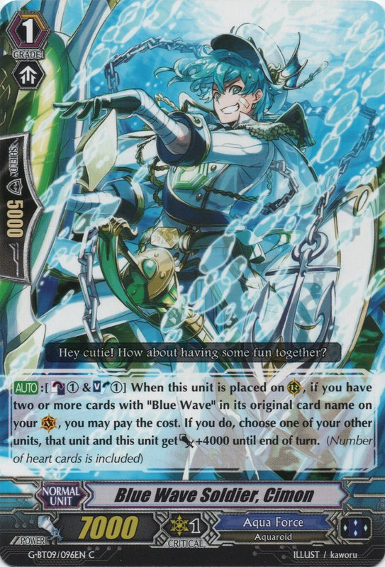 (Auto) :[(CB)1 & (SB)1]: When this unit is placed on (RC), if you have two or more cards with "Blue Wave" in it's original card name on your (VC), you may pay the cost. If you do, choose one of your units. That unit and this unit get (power) +4000 until end of turn.